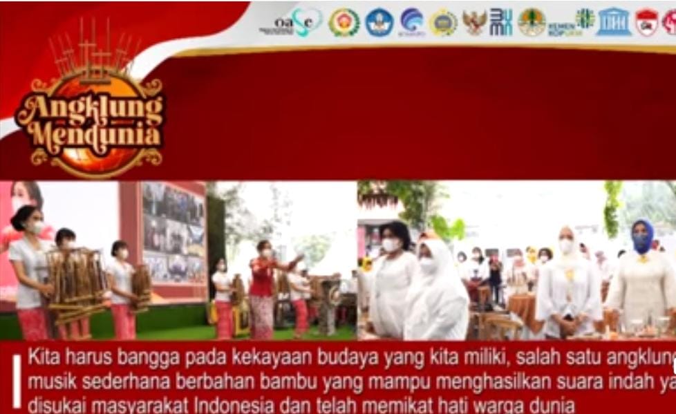 Hal tersebut disampaikan Ibu Negara Republik Indonesia Hj. Iriana Joko Widodo secara virtual pada acara Angklung Mendunia tahun 2021 yang dipusatkan di Museum Satria Mandala, Pusjarah TNI, Jakarta Selatan, Senin (8/11/2021).