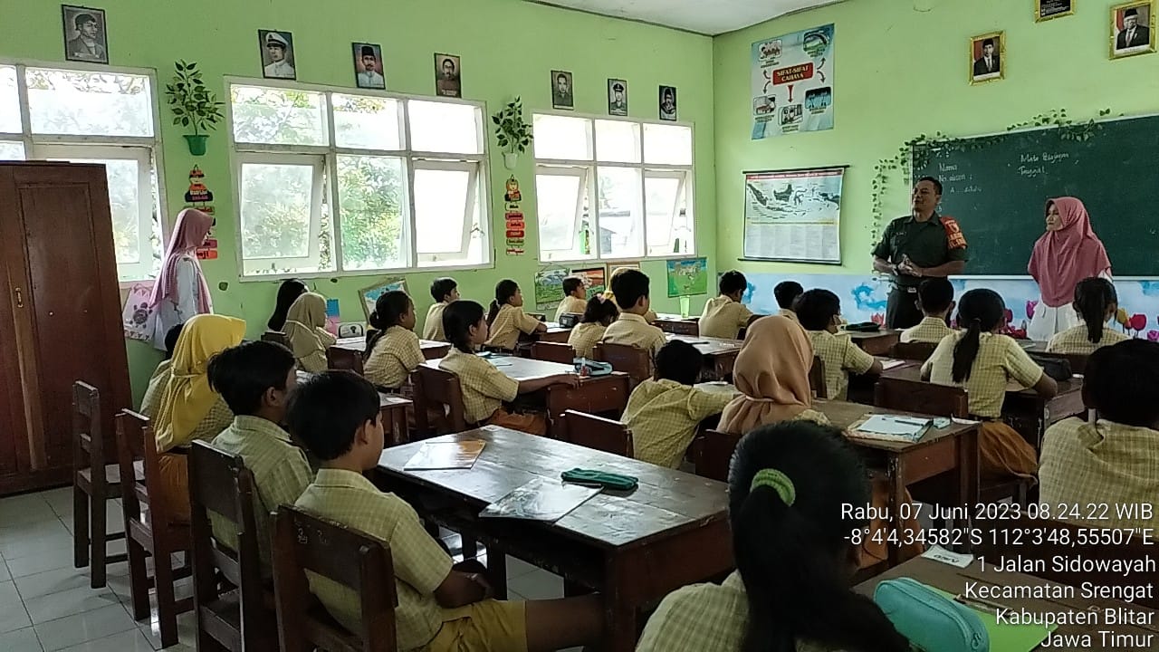 Sertu Ali Japar, dihadapan siswa siswi kelas V SDN Srengat 3, memberikan wawasan kebangsaan terkait pentingnya kedisiplinan dan perbuatan serta perilaku yang baik.