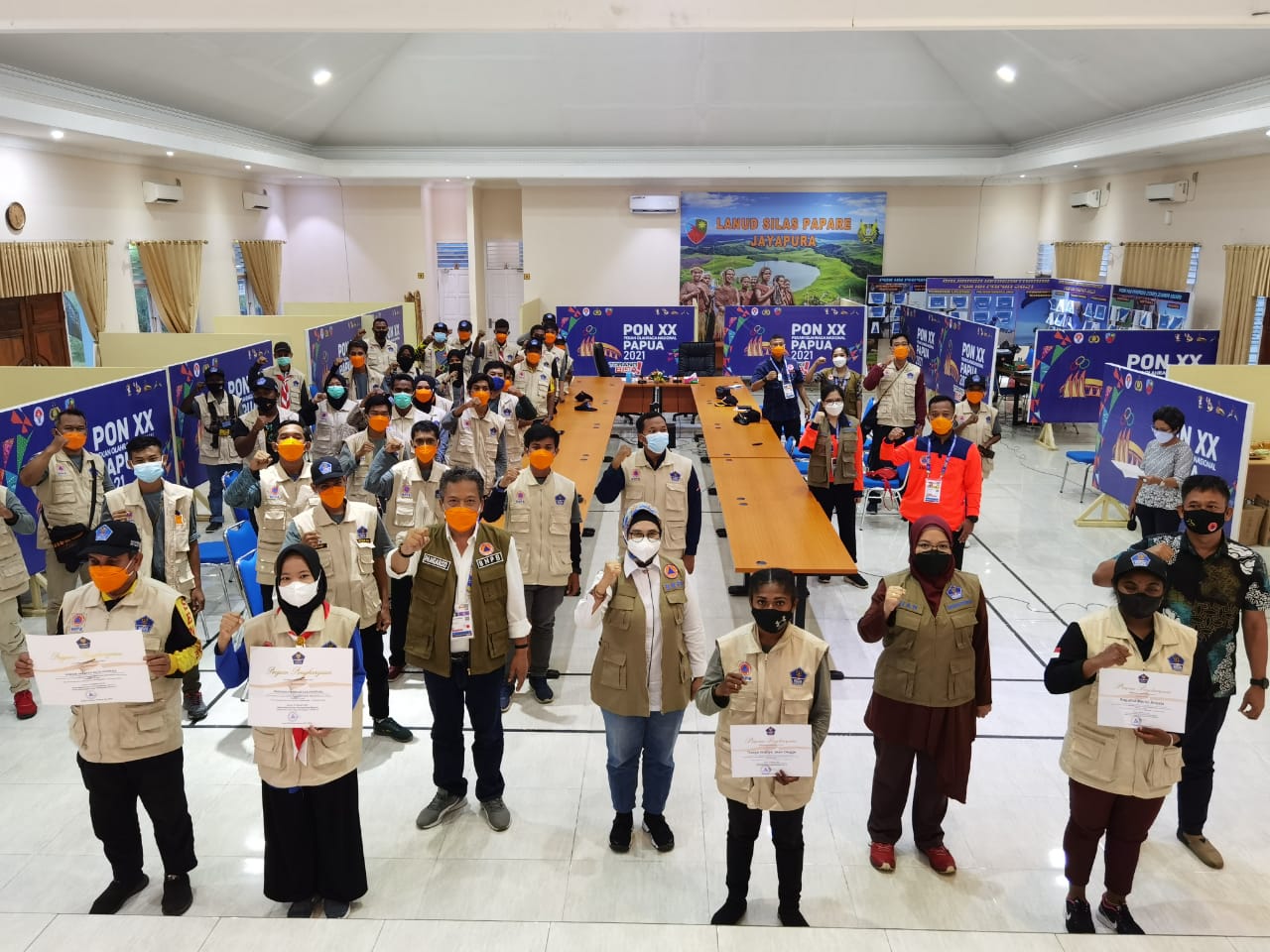 Mendukung penyelenggaraan PON XX yang aman dari COVID-19, BNPB menurunkan 455 relawan protokol kesehatan selama penyelenggaraan kegiatan tersebut di 4 klaster penyelenggaraan PON XX, yakni di Kota Jayapura, Kabupaten Jayapura, Kabupaten Mimika, dan Kabupaten Merauke. Selama 20 hari mulai Minggu (26/10) hingga Jumat (15/10), para relawan ditugaskan untuk memberikan sosialisasi dan edukasi kepada seluruh pihak yang terlibat dalam PON XX terkait protokol kesehatan, khususnya penggunaan masker.