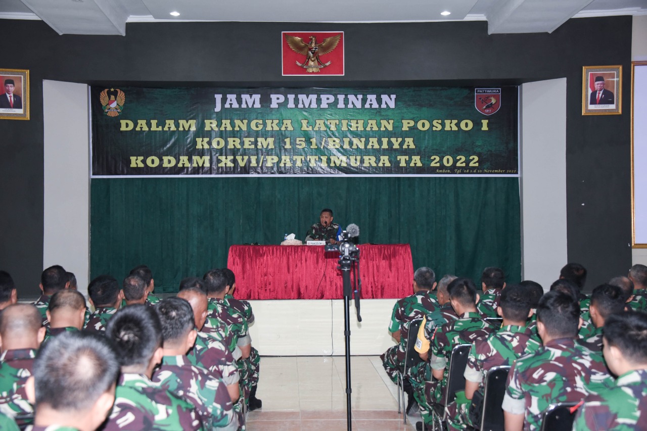 Malukuexpress.com, Pangdam XVI/Pattimura Mayjen TN Ruruh A. Setyawibawa,S.E., M.M. didampingi Sekda Provinsi Maluku Sadly Le secara resmi membuka Latihan Posko I Korem 151/Binaiya di Aula Slamet Riyadi, Makorem 151/Binaiya, Batu Gajah, Kota Ambon, Selasa (08/11/2022).