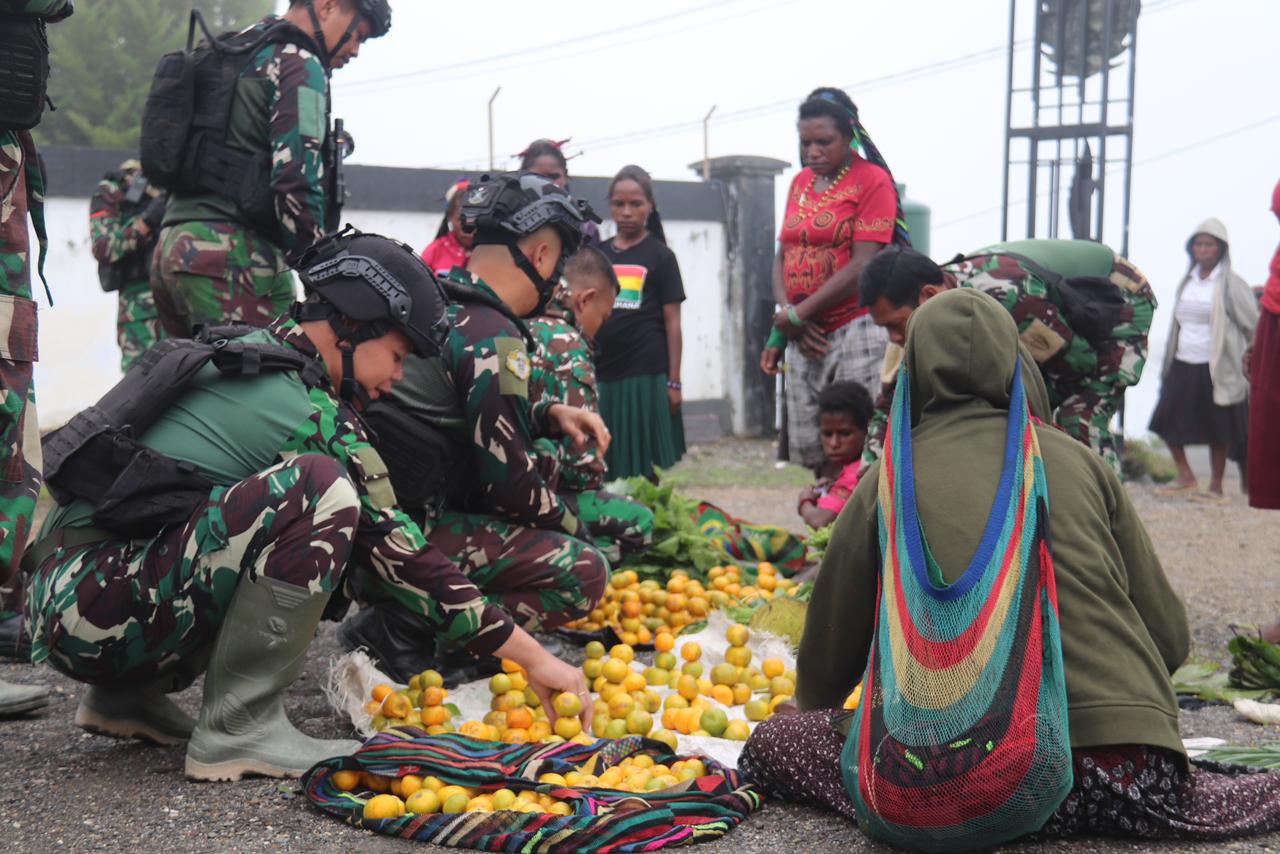 Warga yang melintas dengan membawa barang dagangan dalam nokennya, diarahkan masuk ke halaman Pos Koper dan menggelar dagangannya. “Nanti ada personel yang bertugas mendata harga semua barang yang dijual perorangan, setelah didata langsung dibayar”, terang Lettu Inf Arditto, Danpos Koper.