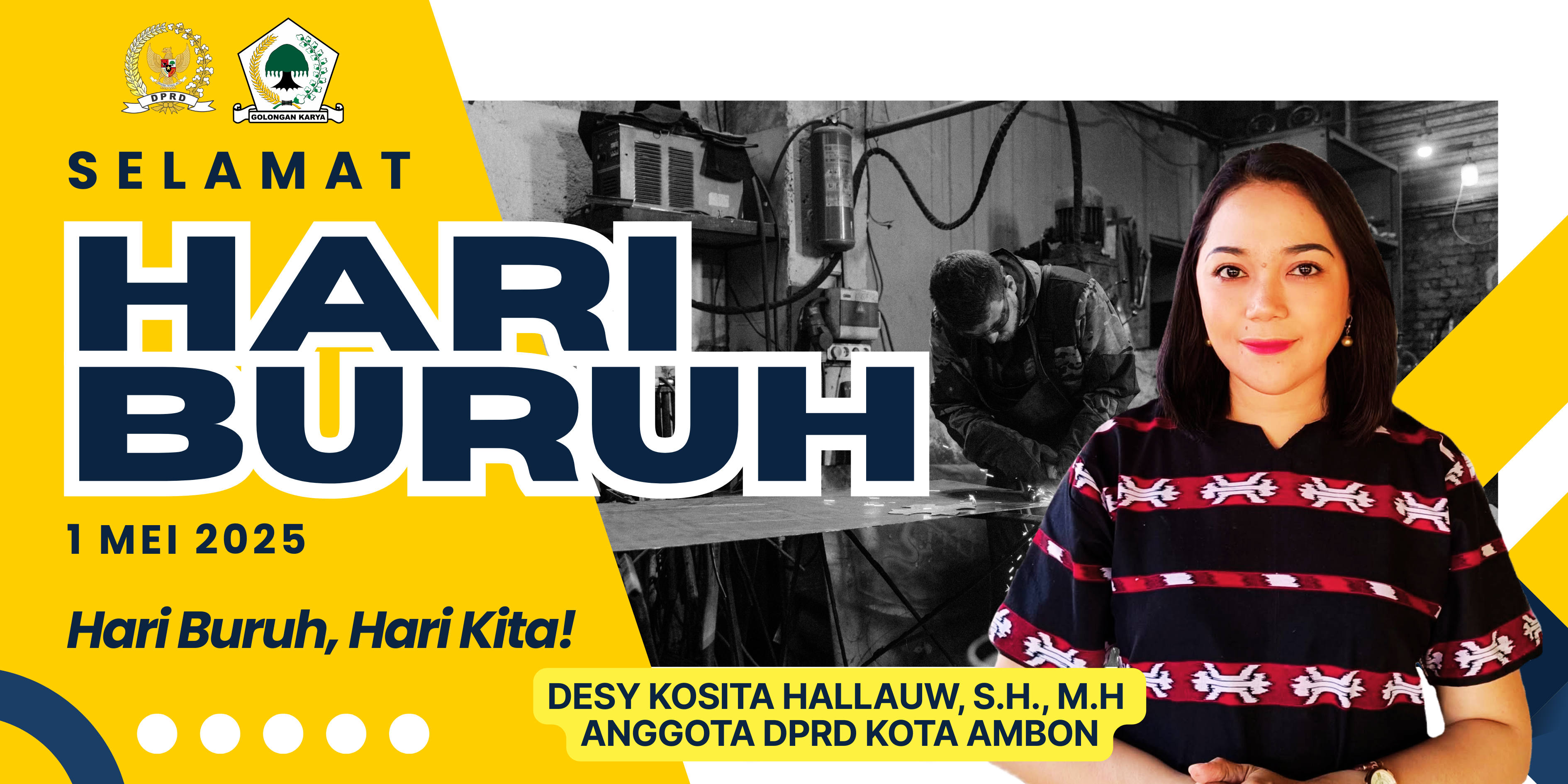 Desy Kosita Hallauw, S.H., M.H Anggota DPRD Kota Ambon Mengucapkan Selamat Hari Buruh 1 Mei Tahun 2025, ‘Hari Buruh, Hari Kita’ adminApril 30, 2025353 Dilihat Post Views: 353 Pos terkaitPengurus DPD Persatuan Masyarakat Buddha Indonesia Provinsi Maluku Mengucapkan Selamat Memperingati Jumat Agung dan Merayakan Paskah Kristus Tahun 2026Steven Izaac Risakotta (Wakil Sekretaris Electoral 2) Mengucapkan Dirgahayu AMGPM Ke 93 Tahun, 27 Maret 2026Steven Izaac Risakotta (Ketua PP AMPG, Ketua DPP Bapera dan Waketum DPP AMPI) Mengucapkan Dirgahayu AMGPM Ke 93 Tahun, 27 Maret 2026Kasatker PJN Wilayah II Provinsi Maluku Ir. TOCE LEUWOL, ST.,MT Mengucapkan Selamat Idul Fitri 1 Syawal 1447 Hijriah/ Tahun 2026 MasehiDLHP Kota Ambon Mengucapkan Selamat Idul Fitri 1 Syawal 1447 Hijriah Tahun 2026Dr. Michael Wattimena, S.E, S.H., MM Komisaris PT Pertamina International Shipping dan Tenaga Ahli Menteri ESDM RI Mengucapkan Selamat Idul Fitri 1 Syawal 1447 Hijriah/2026 M