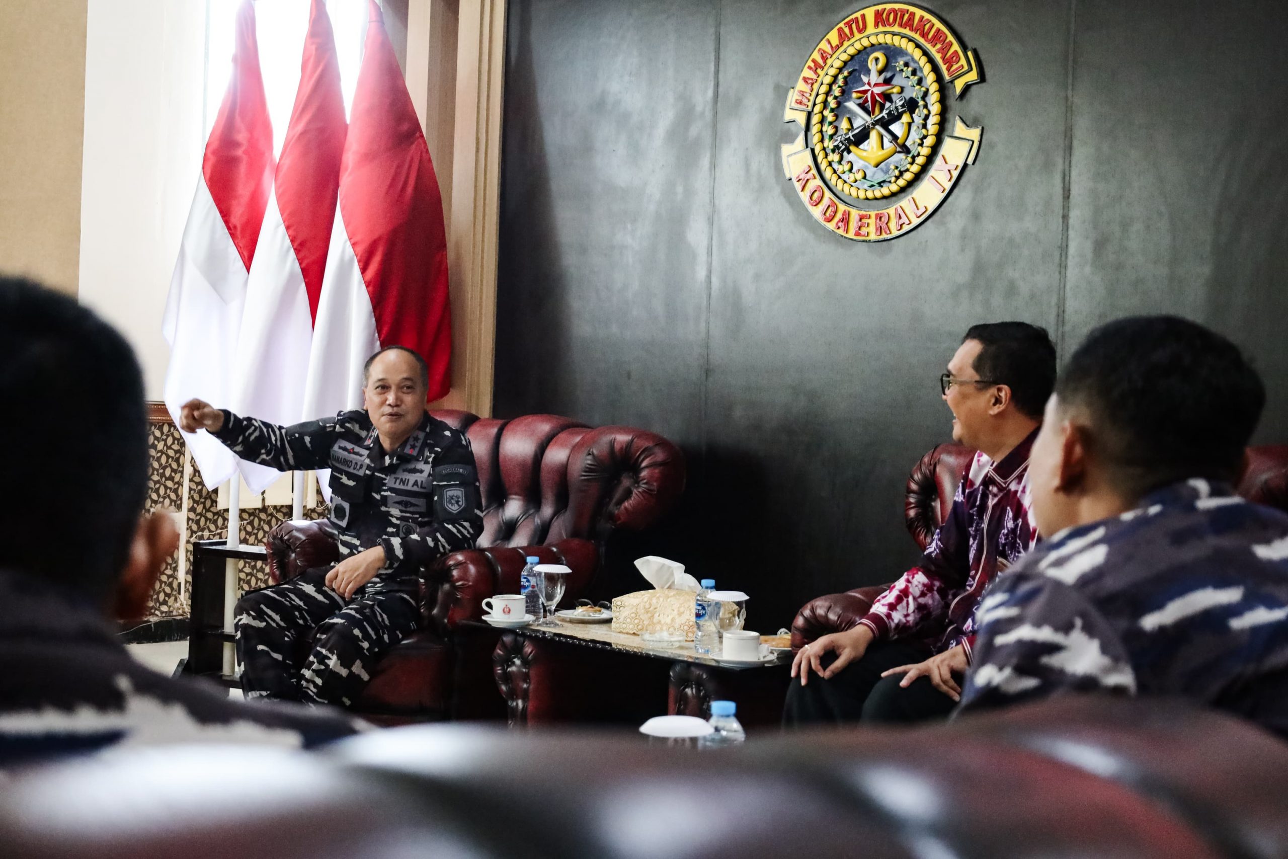 Dankodaeral IX, Laksda Hanarko Djodi P. didampingi PJU Kodaeral IX menerima _Courtesy Call_ dari Perwakilan Bank Indonesia Provinsi Maluku, Deputi Kepala Perwakilan bersama rombongan dalam rangka program kas keliling rupiah berdaulat yang menjangkau wilayah kepulauan, pesisir, serta daerah 3T (terdepan, terpencil, dan tertinggal) di wilayah Maluku.