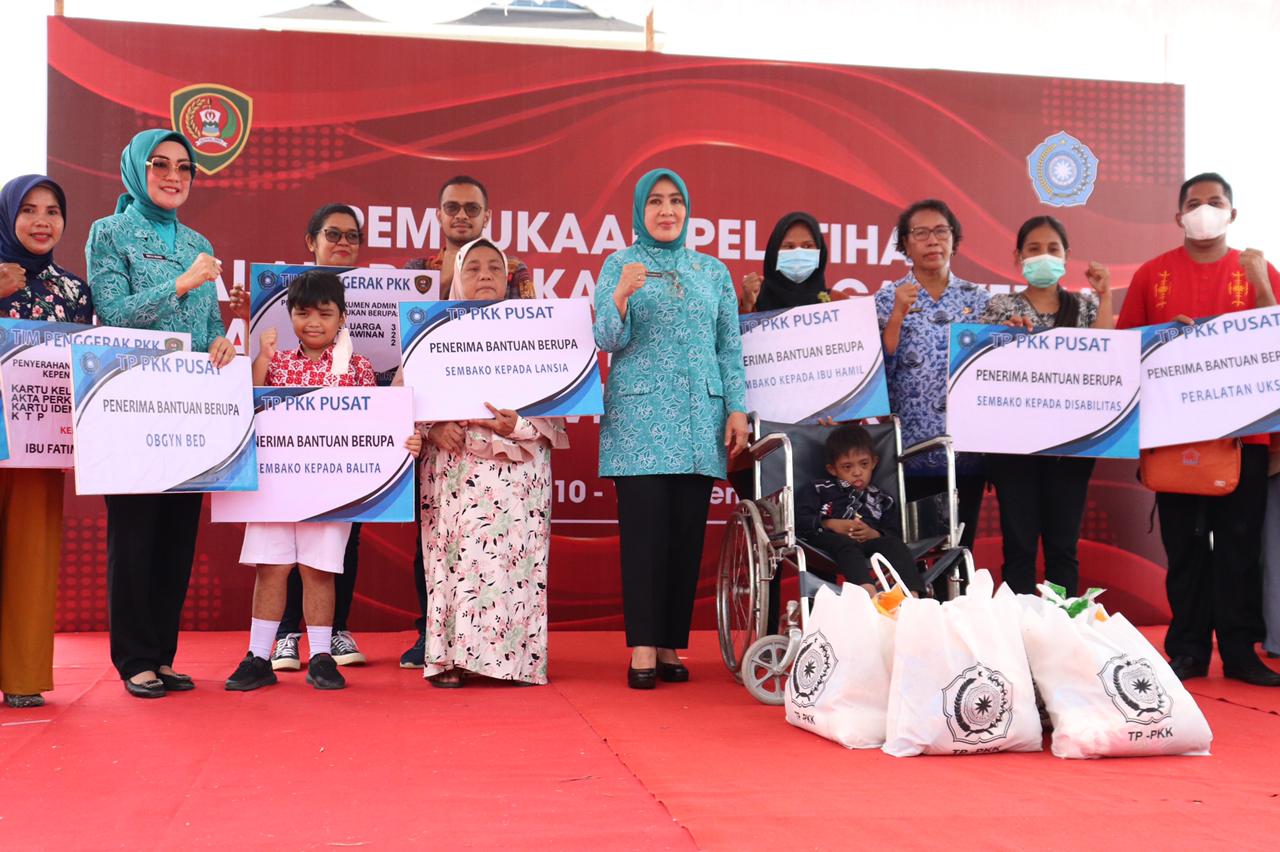 Isteri Mendagri Tito Karnavian itu didampingi Ketua TP PKK Provinsi Maluku, Widya Pratiwi Murad saat menyerahkan bantuan paket sembako yang diperuntukan kepada lansia, balita, ibu hamil, penyandang disabilitas. Bantuan peralatan UKS kepada para siswa serta mesin pemanfaatan sabut kelapa kepada penerima manfaat dan bantuan Obgyn Bed.
