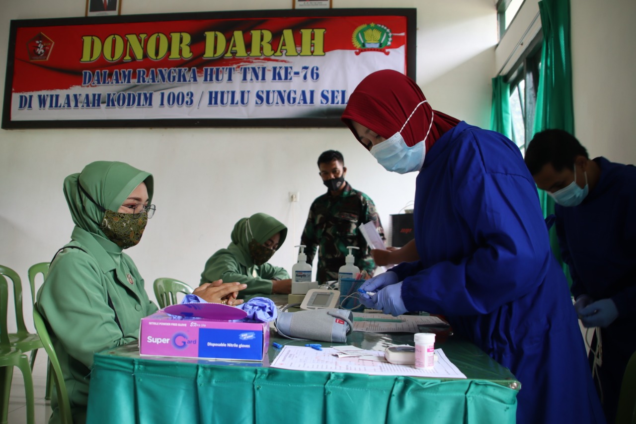 Malukuexpress.com, HSS, Dalam rangka memperingati Hari Ulang Tahun Tentara Nasional Indonesia ke 76 di Wilayah Kodim 1003/Hulu Sungai Selatan dilaksanakan Bakti Sosial berupa donor darah, kali bertempat di aula Markas Kompi Senapan C Yonif 621/Manuntung dijalan A.Yani Kandangan, Jum’at (1/10/2021).