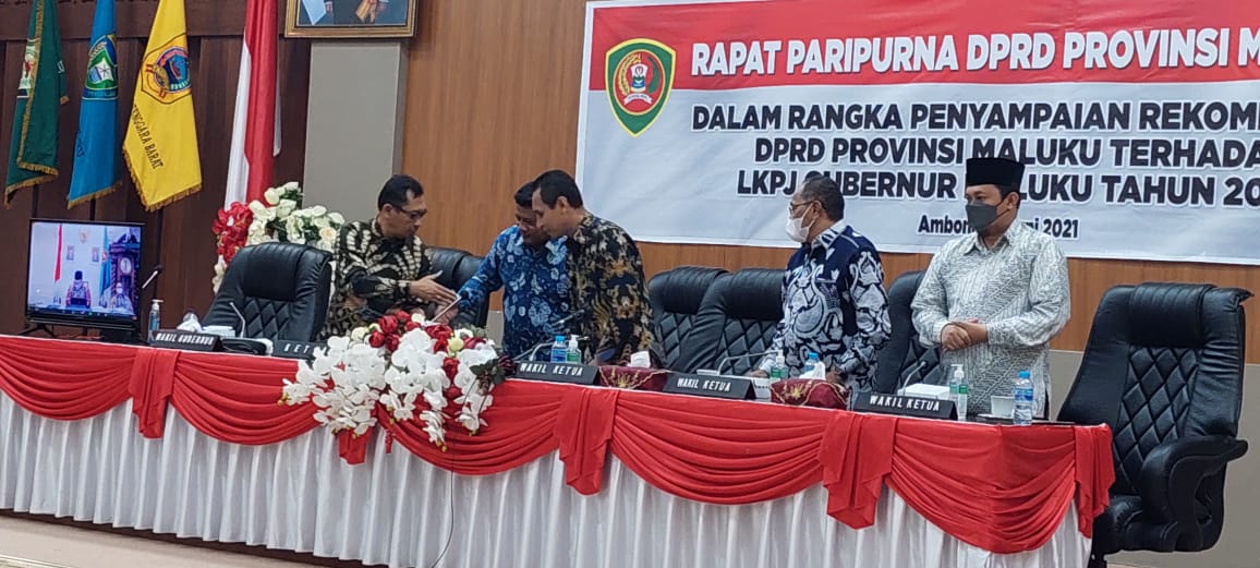 Hasil rekomendasi ini diserahkan melalui rapat paripurna penyampaian rekomendasi dewan terhadap LKPJ Gubernur Maluku Tahun 2020, di Ruang Rapat Paripurna DPRD, Jumat 4/6/2021 yang dipimpin Wakil Ketua DPRD Maluku Melkianus Sairdekut.