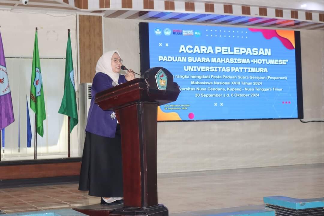 Bertempat di Aula Lantai 2 Rektorat Universitas Pattimura (Kamis, 26/9/24), Wakil Rektor Bidang Kemahasiswaan dan Alumni Universitas Pattimura, Dr. Nur Aida Kubangun, M.Pd secara resmi melepas Tim Paduan Suara Mahasiswa HOTUMESE Universitas Pattimura yang ditandai dengan penyerahan Bendera Universitas Pattimura kepada perwakilan mahasiswa, untuk mengikuti lomba Pesta Paduan Suara Gerejawi (Pesparawi) Mahasiswa Nasional XVIII Tahun 2024 di Universitas Cendana, Kupang – Nusa Tenggara Timur pada tanggal 30 September – 6 Oktober 2024.