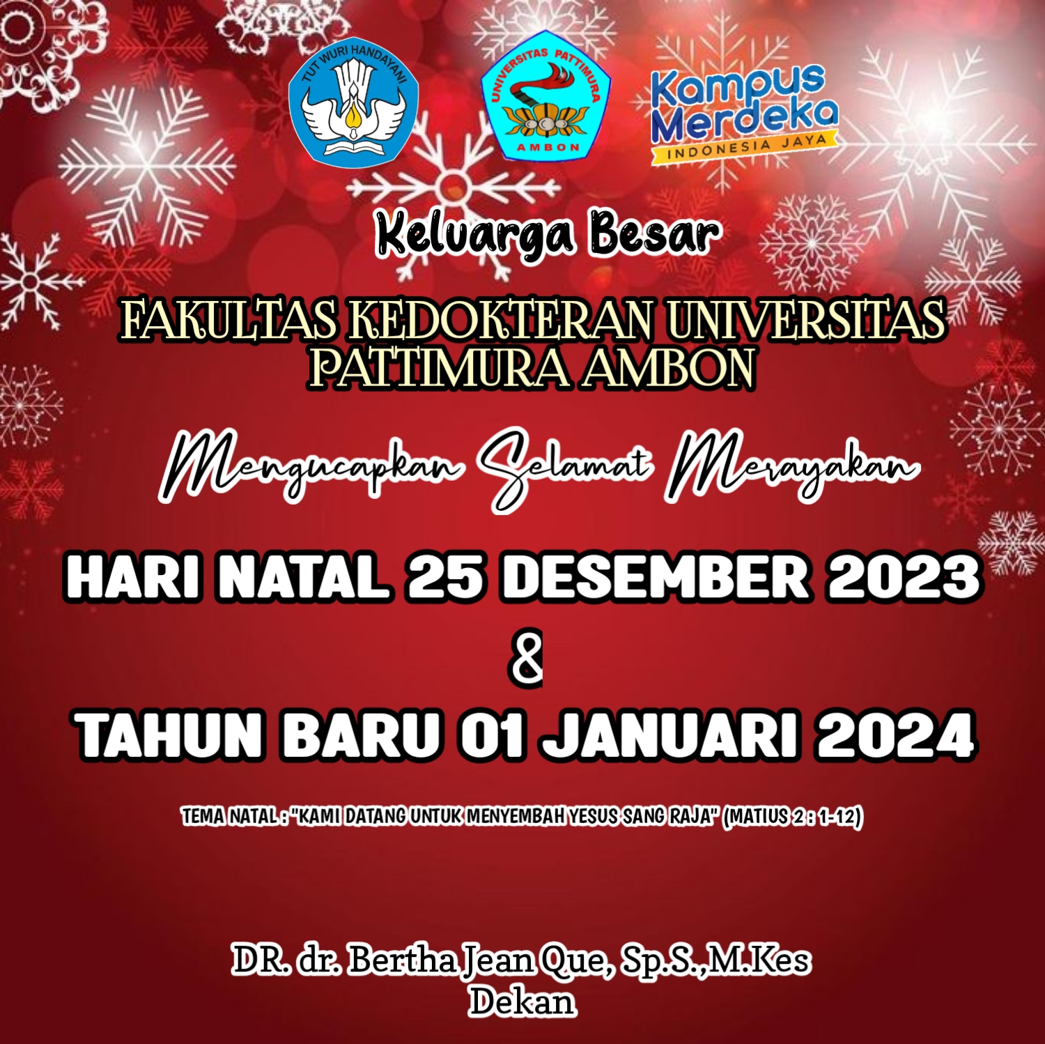FAKULTAS KEDOKTERAN UNIVERSITAS PATTIMURA AMBON MENGUCAPKAN SELAMAT NATAL 25 DESEMBER 2023 DAN TAHUN BARU 01 JANUARI 2024 adminDesember 21, 2023Desember 26, 2023620 Dilihat Post Views: 620 Pos terkaitPengurus DPD Persatuan Masyarakat Buddha Indonesia Provinsi Maluku Mengucapkan Selamat Memperingati Jumat Agung dan Merayakan Paskah Kristus Tahun 2026Steven Izaac Risakotta (Wakil Sekretaris Electoral 2) Mengucapkan Dirgahayu AMGPM Ke 93 Tahun, 27 Maret 2026Steven Izaac Risakotta (Ketua PP AMPG, Ketua DPP Bapera dan Waketum DPP AMPI) Mengucapkan Dirgahayu AMGPM Ke 93 Tahun, 27 Maret 2026Kasatker PJN Wilayah II Provinsi Maluku Ir. TOCE LEUWOL, ST.,MT Mengucapkan Selamat Idul Fitri 1 Syawal 1447 Hijriah/ Tahun 2026 MasehiDLHP Kota Ambon Mengucapkan Selamat Idul Fitri 1 Syawal 1447 Hijriah Tahun 2026Dr. Michael Wattimena, S.E, S.H., MM Komisaris PT Pertamina International Shipping dan Tenaga Ahli Menteri ESDM RI Mengucapkan Selamat Idul Fitri 1 Syawal 1447 Hijriah/2026 M