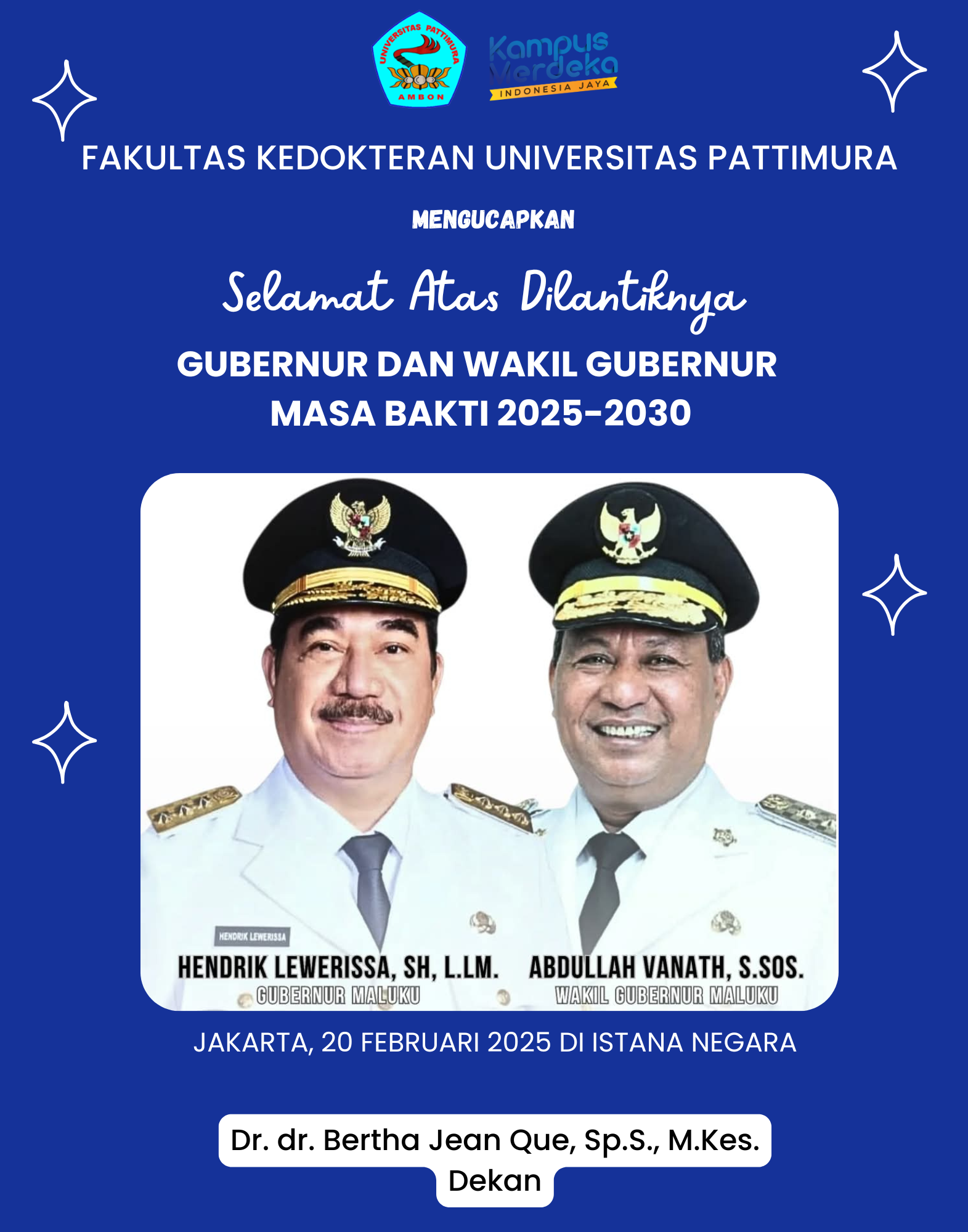 Fakultas Kedokteran Unpatti Ambon Mengucapkan Selamat Atas Dilantiknya Bapak Hendrik Lewerissa dan Bapak Abdullah Vanath Sebagai Gubernur dan Wakil Gubernur Maluku Masa Bakti 2025 – 2030.