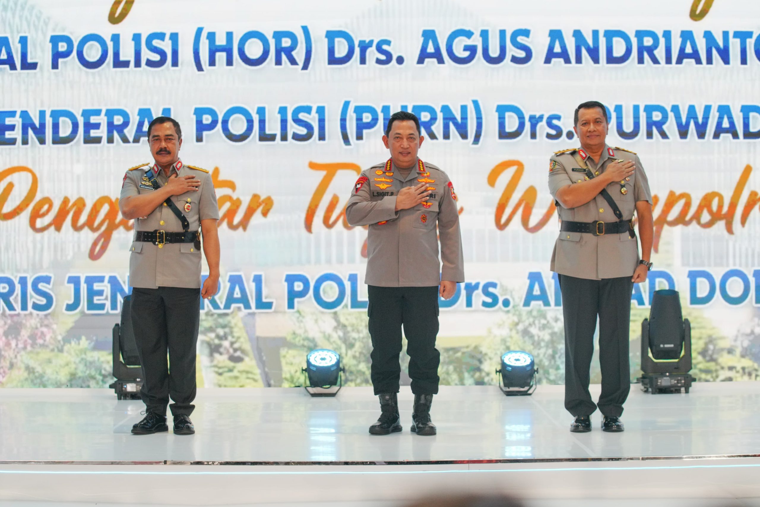 Pada puncak acara, Kapolri mengantarkan Jenderal (HOR) Agus Andrianto dan Komjen (Purn) Purwadi Arianto keluar dari Auditorium untuk menjalani acara seremonial prosesi pedang pora yang diiringi oleh marching band.