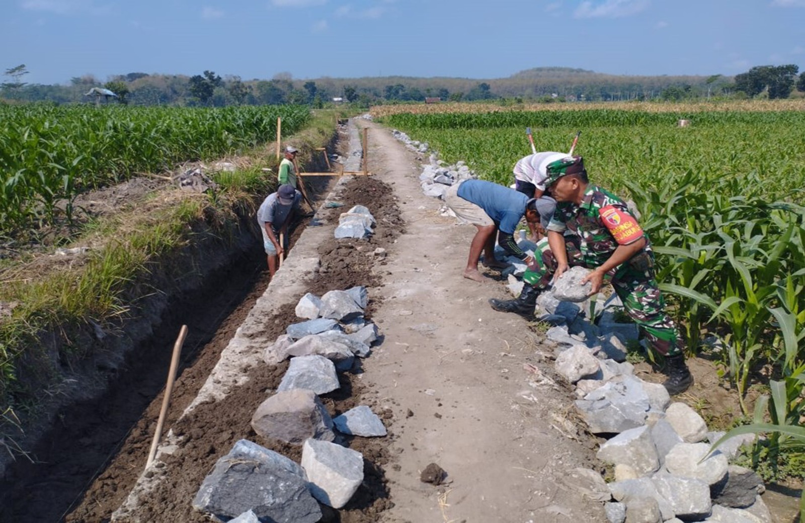 MALUKUEXPRESS.COM, Blitar – Dalam upaya mendukung pembangunan di wilayah binaannya, Sertu Nurkayadi Babinsa Koramil 0808/16 Talun bersama warga masyarakat setempat, pagi ini melaksanakan kegiatan kerja bakti pembangunan saluran irigasi di area persawahan di Dusun Jabung RT. 03 RW. 02 Desa Jabung Kec. Talun Kab. Blitar, Senin (5/8/2024).