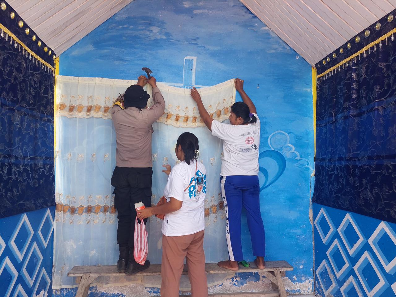 Dengan penuh antusias dan semangat kebersamaan yang tinggi, Bhabinkamtibmas terlihat ikut berbaur dan bahu membahu bersama Warga memasang kain, membersihkan lingkungan hingga memperbaiki tenda. Meskipun mengenakan pakaian dinas Polri, tidak menjadi penghalang bagi Bhabinkamtibmas untuk ikut membantu Warga binaannya.