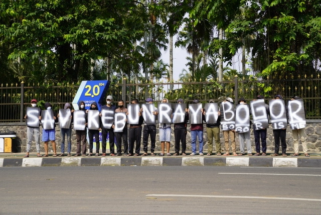 Sebagian diantara tulisan membentangkan spanduk penolakan bertuliskan “Bogorisme”.