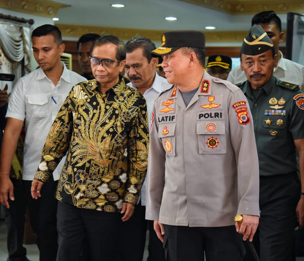 MALUKUEXPRESS.COM, POLDAMALUKU- Kapolda Maluku Irjen Pol Lotharia Latif, ikut menyambut kedatangan Menteri Koordinator Politik, Hukum dan Keamanan (Menkopolhukam), Mahfud MD, dan Menteri Dalam Negeri (Mendagri) Jenderal Polisi (Purn) M. Tito Karnavian, di Bandara Pattimura, Kota Ambon, Rabu (14/6/2023).
