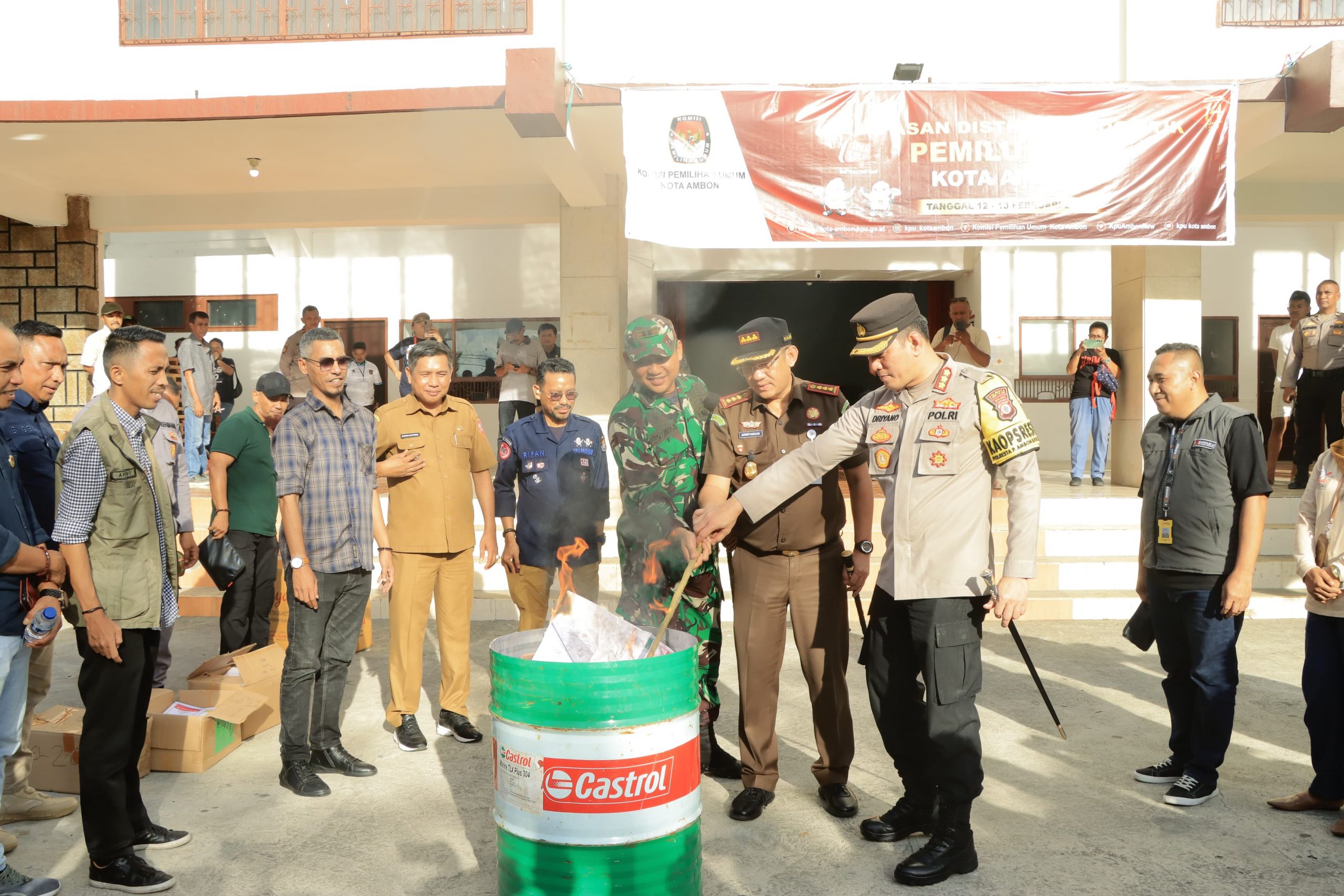 Kegiatan pemusnahan ini dihadiri oleh penjabat Walikota Ambon Bodewin Wattimena, Dandim 1504/Ambon Letkol Inf. Leo Octavianus M. Sinaga, Kajari Ambon Adhryansa, Ketua Bawaslu Provinsi Subair, Ketua KPU Kota Ambon Bpk. M. Seddek Fuad, Ketua Bawaslu Kota Ambon Albert. J. Talabessy, Kordif KPU Kordif Teknis KPU Rudi Layn, Kordif P3S Bawaslu Kota Ambon Ibu Suminar Sehuwakim.