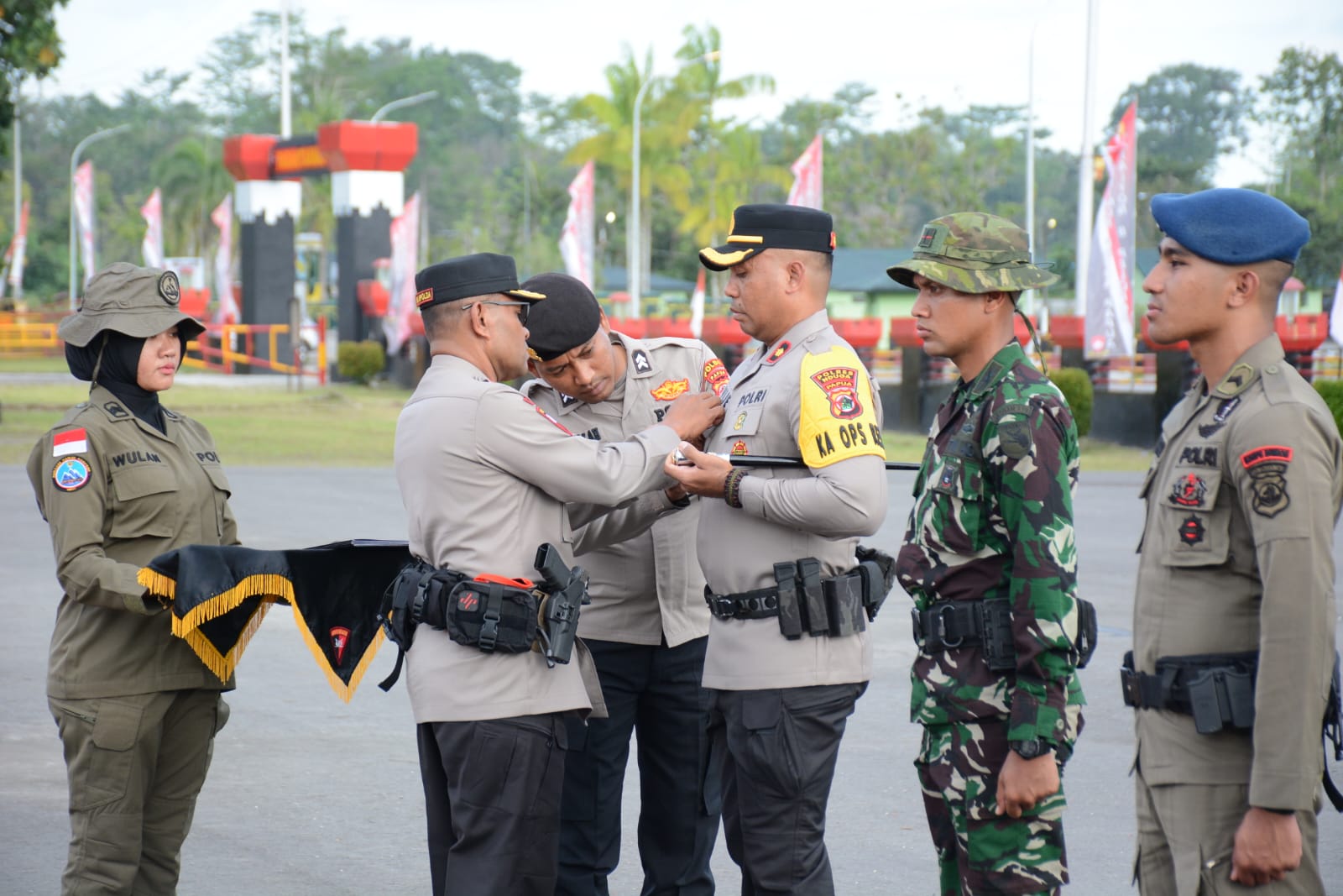 “Pagi ini saya mewakili Bapak Kapolri menyematkan Pin Emas Kapolri kepada personel satgas Operasi Damai Cartenz baik TNI Maupun Polri” Ujar Patridge