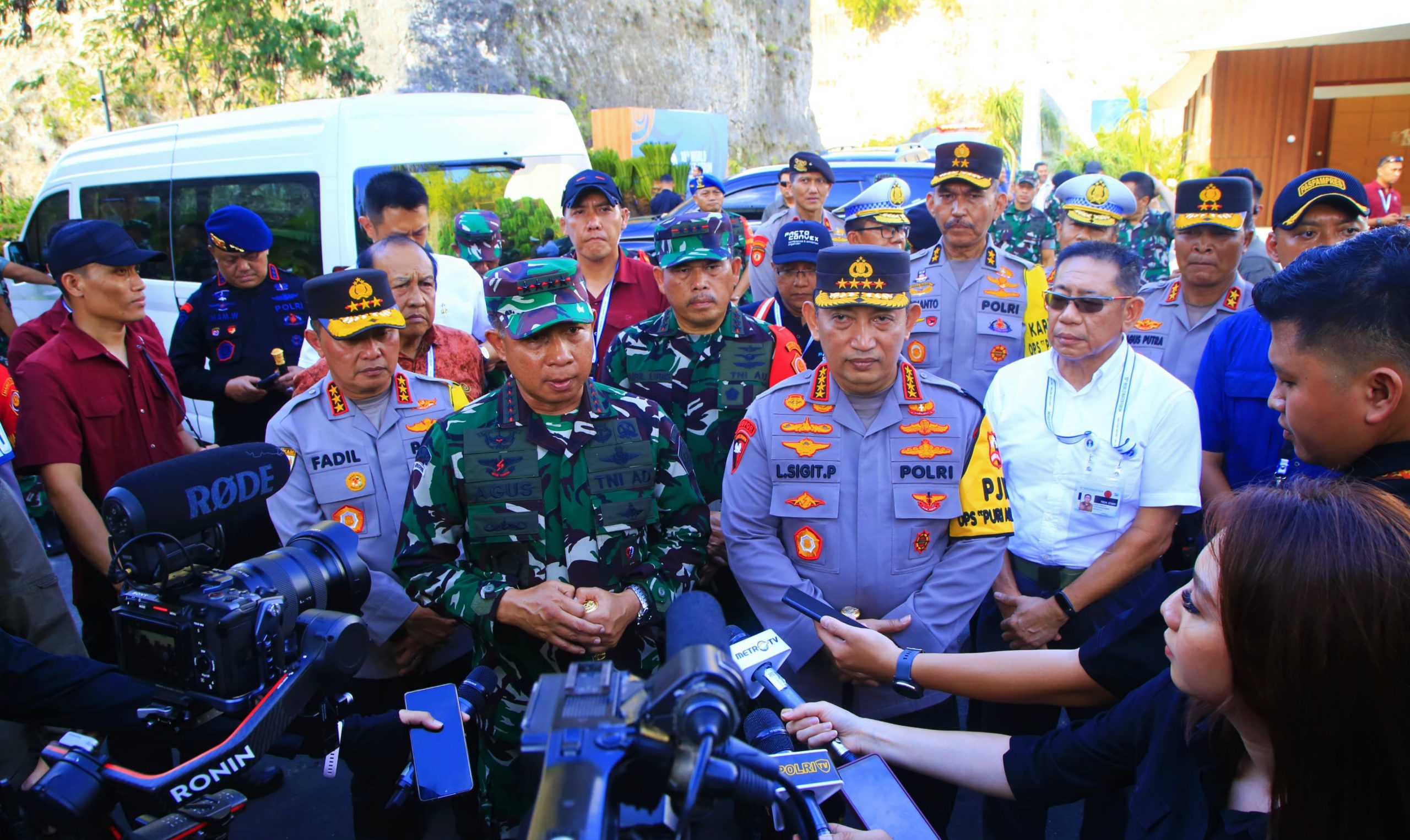 “Tentunya kami dengan Panglima dalam hal ini melihat langsung TFG maupun pelaksanaan kegiatan pengamanan di lokasi-lokasi mulai dari kedatangan kemudian venue yang digunakan termasuk juga tempat di titik ini (GWK), untuk memastikan bahwa pengamanan di ring 1, ring 2 dan ring 3 semuanya berjalan aman dan lancar,” kata Kapolri di GWK.
