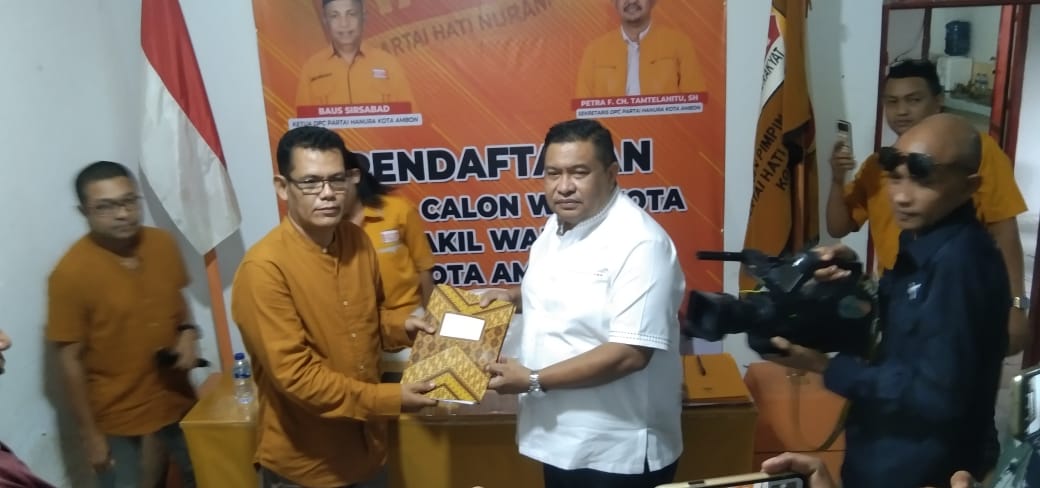 Kedatangan Ririmase beserta tim dalam rangka untuk mengembalikan formulir penjaringan Bakal Calon Walikota Ambon dan diterima Ketua Desk Pilkada DPC Hanura Kota Ambon Muliyono Sudrik beserta tim