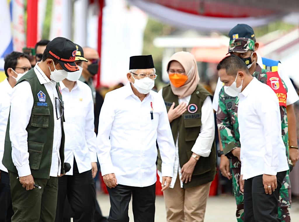 LUMAJANG – Kepala Badan Nasional Penanggulangan Bencana (BNPB) Letjen TNI Suharyanto S.Sos., M.M., mendampingi Wakil Presiden (Wapres) RI KH. Ma’ruf Amin dalam peninjauan pembangunan hunian tetap (huntap) dan hunian sementara (huntara), sebagai pelaksanaan rehabilitasi dan rekonstruksi bencana awan panas guguran (APG) erupsi Gunung Semeru di Desa Sumbermujur, Kecamatan Candipuro, Kabupaten Lumajang, Jawa Timur, Kamis (2/6). Kegiatan peninjauan itu dilakukan guna memastikan pembangunan huntap dan huntara sudah sesuai target dan spesifikasinya dapat memenuhi kebutuhan warga.
