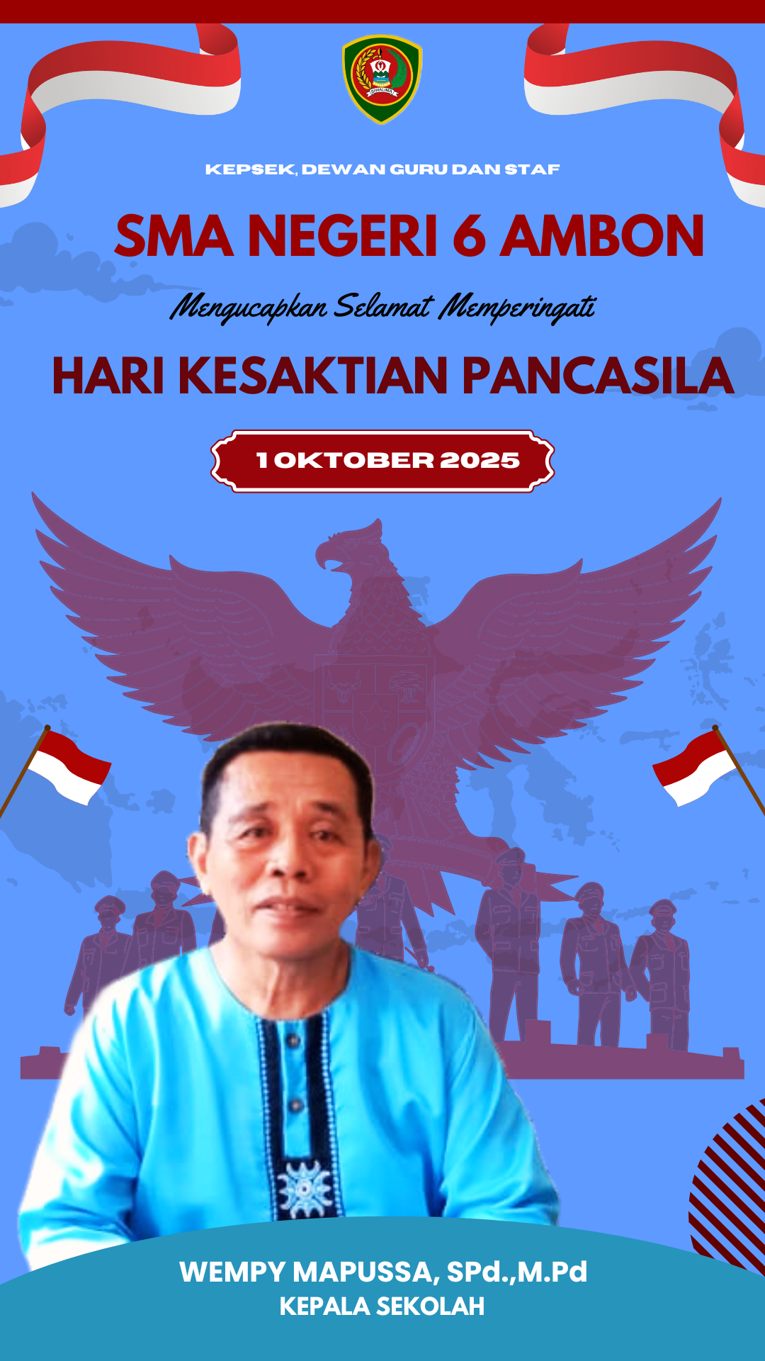 Kepsek, Dewan Guru dan Staf, SMA Negeri 6 Ambon Mengucapkan Selamat Memperingati Hari Kesaktian Pancasila 1 Oktober 2025 adminSeptember 29, 2025Oktober 1, 2025283 Dilihat Post Views: 283 Pos terkaitPengurus DPD Persatuan Masyarakat Buddha Indonesia Provinsi Maluku Mengucapkan Selamat Memperingati Jumat Agung dan Merayakan Paskah Kristus Tahun 2026Steven Izaac Risakotta (Wakil Sekretaris Electoral 2) Mengucapkan Dirgahayu AMGPM Ke 93 Tahun, 27 Maret 2026Steven Izaac Risakotta (Ketua PP AMPG, Ketua DPP Bapera dan Waketum DPP AMPI) Mengucapkan Dirgahayu AMGPM Ke 93 Tahun, 27 Maret 2026Kasatker PJN Wilayah II Provinsi Maluku Ir. TOCE LEUWOL, ST.,MT Mengucapkan Selamat Idul Fitri 1 Syawal 1447 Hijriah/ Tahun 2026 MasehiDLHP Kota Ambon Mengucapkan Selamat Idul Fitri 1 Syawal 1447 Hijriah Tahun 2026Dr. Michael Wattimena, S.E, S.H., MM Komisaris PT Pertamina International Shipping dan Tenaga Ahli Menteri ESDM RI Mengucapkan Selamat Idul Fitri 1 Syawal 1447 Hijriah/2026 M