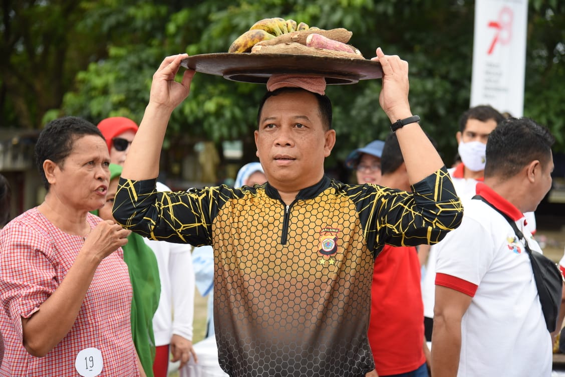 Irjen Latif tampak gembira mengikuti lomba keku dulang di kepala. Ia berjalan dengan hati-hati agar dulang berisi hasil panen warga yang diletakan di kepala tidak terjatuh.