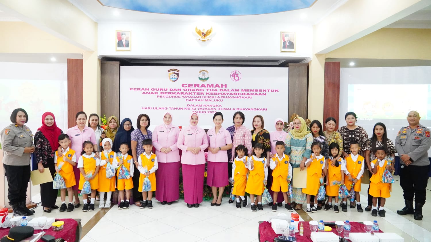 Malukuexpress.com, POLDAMALUKU- Ketua Pengurus Yayasan Kemala Bhayangkari (YKB) Daerah Maluku, Ny. Evi Lotharia Latif, mengajak para guru dan orang tua untuk dapat berperan dalam membentuk anak berkarakter Bhayangkara.