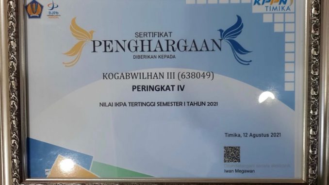 Malukuexpress.com, Kogabwilhan III dengan komando kepemimpinan Panglima Letjen TNI Jeffry Apoly Rahawarin yang selalu bersama jajaran Kogabwilhan III untuk Bekerja Cepat, rajin dan sesuai Motto, hasil prestasi di usia Satker yang masih relatif muda. Satker Kogabwilhan III yang baru pertama kali memiliki DIPA di TA 2021 ini telah mengukir prestasi yang membanggakan dengan diperolehnya Piagam Penghargaan IKPA pada Semester I TA 2021, peringkat ke 4 dari 40 Satker Layanan KPPN Timika. Kamis (14/10/2021).