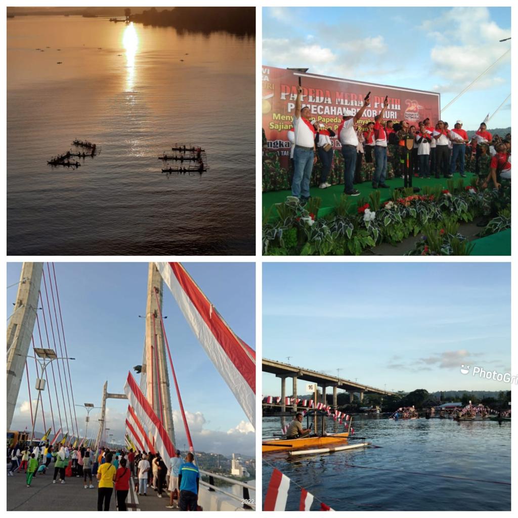Malukuexpress.com, Sempat tertunda beberapa waktu lalu, Kodam XVI/ Paattimura pecahkan rekor muri makan papeda terbanyak dan terpanjang diatas ikon kota Ambon, Jembatan Merah Putih, Minggu (22/05/2022).