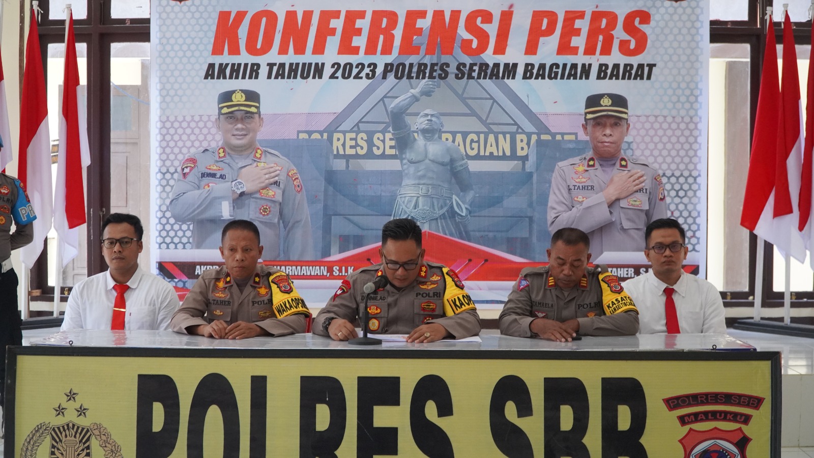 Wakapolres SBB KOMPOL LA UDIN TAHER, S.IP, Kabag Ops Polres SBB AKP DJAFAR LESSY, SE, Kabag SDM Polres SBB AKP MISSEN H. NGONGOBILI, Kasat Reskrim Polres SBB AKP I KADEK D. P. Putra S.T.R, S.I.K, MH, Kasat Lantas Polres SBB AKP L. D. TAMAELA, Kasat Narkoba Polres SBB AKP ARDO WIDIAWAN, S.I.K, Kasi Humas Polres SBB IPDA SAMUEL, Kasi TIK IPDA I. KOMANG ARJAYA dan Para wartawan/pers. Kegiatan konferensi pers ini berakhir pada pukul 15.05 wit dengan situasi yang terkendali dan aman.