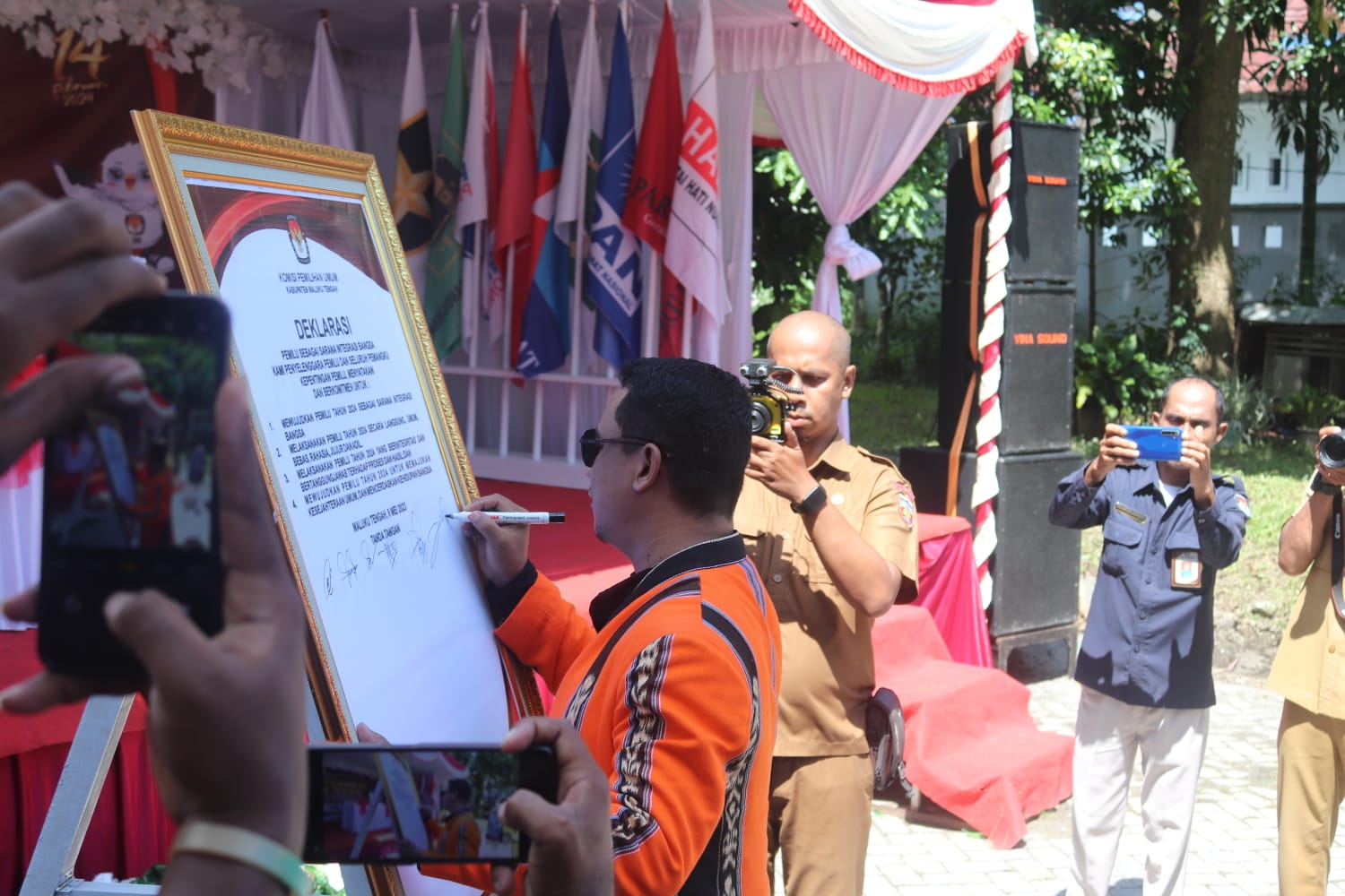 momentum kirab itu, Ketua dan Anggota KPU Malteng, menyambut para tamu dari KPU Kabupaten Seram Bagian Timur (SBT) yang membawa estapet Kirab Pemilu untuk dikibarkan di Kabupaten Malteng.