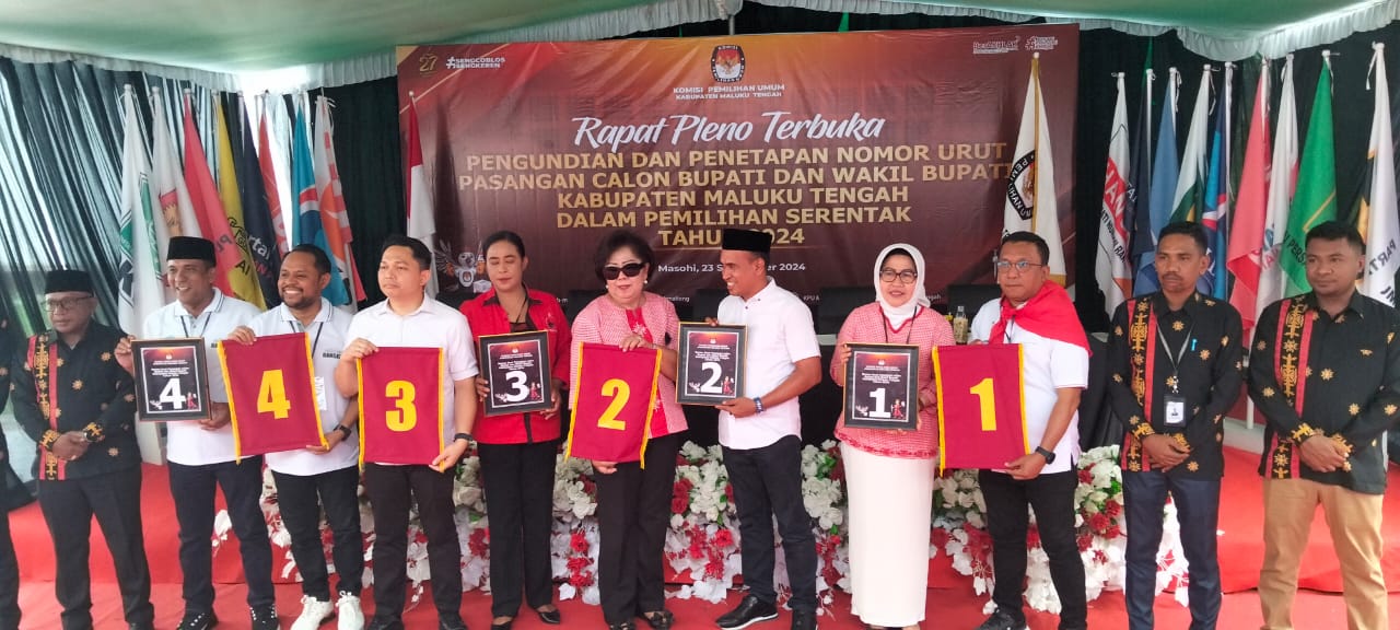 “Pasangan nomor urut 3 (tiga) Andi Munaswir dan Tina W Tetelepta (AMANAT), Partai pengusung PKB dan PDIP. Sementara pasangan nomor urut 4 (empat) Zulkarnain Awat Amir dan Mario Lawalata (MALTENG BANGKIT) Partai pengusung, PKS, PAN, Golkar, Gerindra dan Partai Demokrat. Dengan senantiasa mengharapkan ridho Allah SWT dengan ini ditetapkan,” kata Lesnussa saat membacakan SK penetapan nomor urut pasangan calon, peserta pemilihan Bupati dan Wakil Bupati Malteng Tahun 2024.