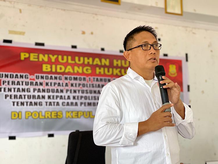 Penyuluhan ini mengangkat materi terkait Undang-Undang Nomor 1 Tahun 2023 tentang 2023 tentang KUHP, Peraturan Kepala Kepolisian Nomor 12 Tahun 2014 tentang panduan penyusunan kerjasama Polri dan Peraturan Kepala Kepolisian Nomor 2 Tahun 2017 tentang tata cara pemberian bantuan hukum di Polres Kepulauan Tanimbar.