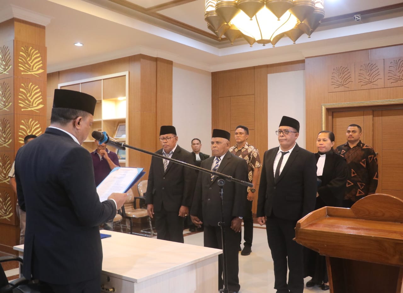 Malukuexpress.com, Masohi – Bertempat di lantai dua kantor Bupati Maluku Tengah, Pj. Bupati Dr Rakib Sahubawa yang di wakili oleh Pj. Sekretariat Daerah Jauhari Tuarita melantik dan mengambil sumpah jabatan tiga Penjabat Kepala Pemerintahan Negeri (KPN), jumat malam (3/5/2024).