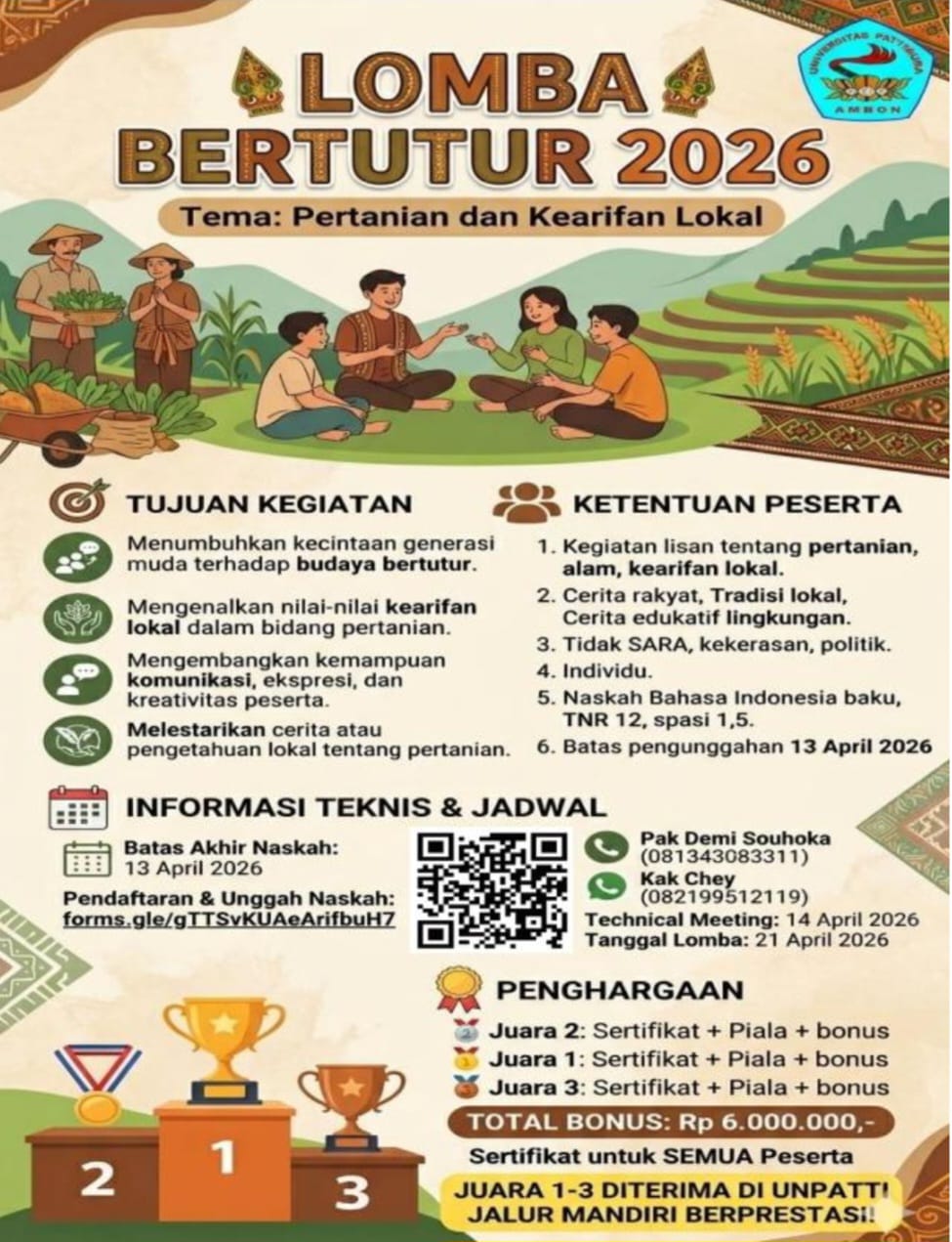 Ambon kembali panas dengan event edukatif dan budaya! Universitas Pattimura resmi menggelar Lomba Bertutur 2026 dengan tema besar: “Pertanian dan Kearifan Lokal”