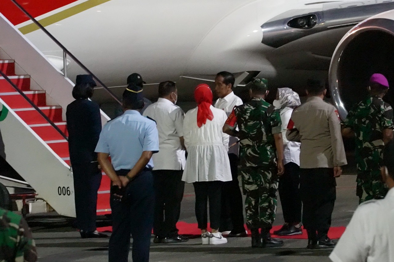 Tiba di bandara Internasional Pattimura, Ambon, kedatangan Presiden dan Ibu Iriana disambut Wakil Gubernur Maluku, Barnabas Nathaniel Orno, Danlanud Pattimura, Dandim beserta Penjabat Sekda Maluku Sadali Ie.