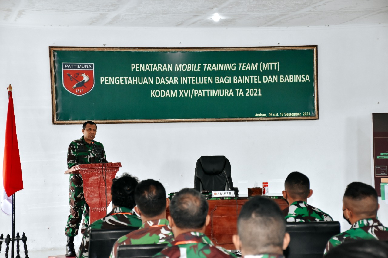 Malukuexpress.com, Pangdam XVI/ Pattimura, Mayjen TNI Bambang Ismawan, S.E, M.M yang diwakilkan oleh Asintel Kasdam XVI/Pattimura, Kolonel Inf CDB. Andries, selaku Komandan Satuan Penataran membuka MTT (Mobile Training Team) Pengetahuan Dasar Intel di Rindam, Suli , Senin (6/09/2021).
