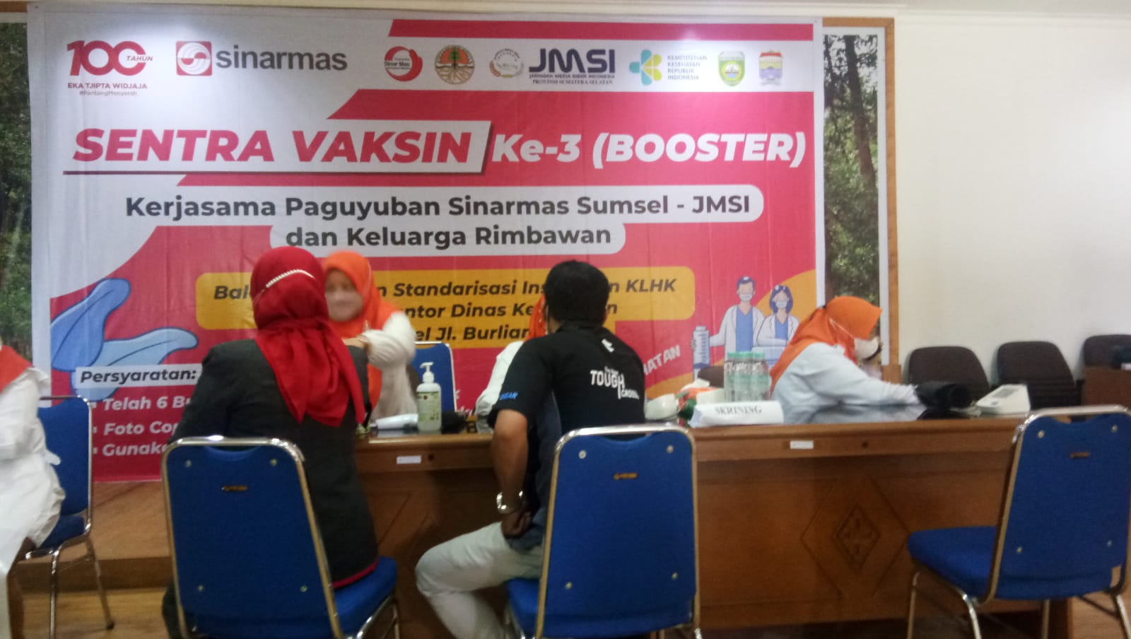 Palembang – Paguyuban Sinarmas Sumsel bersama JMSI (Jaringan Media Siber Indonesia) Sumsel dan Keluarga Rimbawan, Selasa (15/2/2022) menggelar vaksinasi tahap 3 Booster di Balai Penerapan Standarisasi Instrumen Kementrian Lingkungan Hidup dan Kehutanan Palembang.