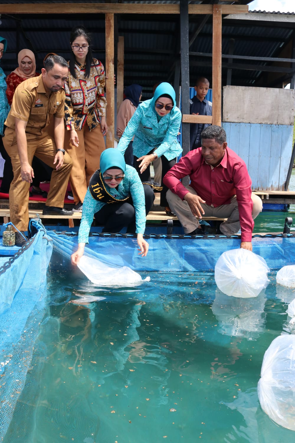 Malukuexpress.com, AMBON – Ketua TP PKK Provinsi Maluku, Widya Pratiwi Murad, melakukan panen budidaya ikan sistem keramba jaring apung, Selasa (31/1/23) di Kampus SUPM/Politeknik Kelautan dan Perikanan Maluku, Waiheru, Kecamatan Baguala, Kota Ambon.