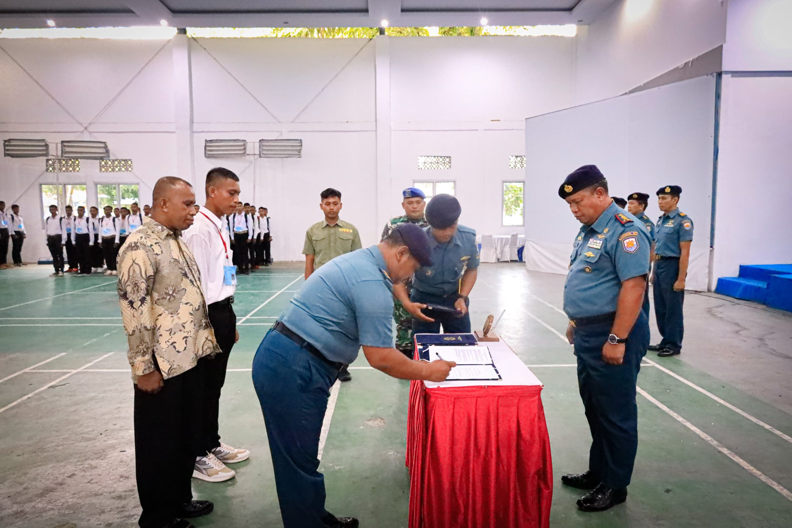 MALUKUEXPRESS.COM, TNI Angkatan Laut. Pangkalan Utama TNI Angkatan Laut (Lantamal) IX Ambon. Brigadir Jenderal TNI (Mar) Suwandi, S.A.P., M.M., diwakili Wakil Komandan (Wadan) Lantamal IX Kolonel Laut (P) Batos Leksono Menandatangani Pakta Integritas Calon Tamtama (CATA) Prajurit Karir (PK) Gelombang I Tahun Anggaran 2025 bertempat di Gedung DR J Leimena Lantamal IX, Kompleks Lantamal IX Ambon, Desa Halong, Kec. Baguala, Kota Ambon, Maluku. Selasa (04/02/2025)