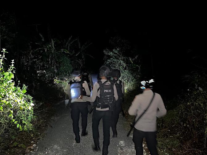 Sambil berjalan kaki, tampak Personel melakukan patroli dan menyisir sejumlah lokasi di kedua Desa tersebut. Mereka pun tampak menyambangi Warga yang masih beraktivitas di malam hari, sembari memberikan Imbauan dan pesan Kamtibmas.