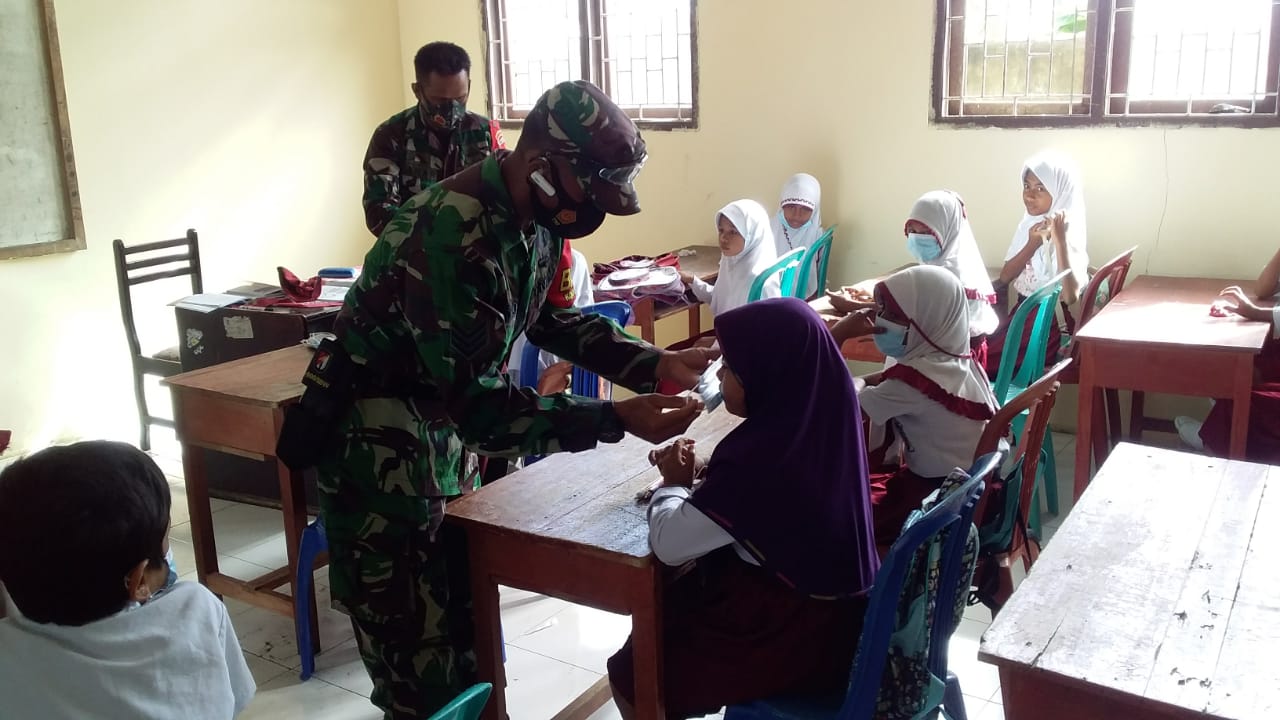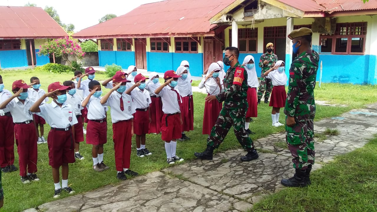 Halut – Dalam rangka mencegah peningkatan penyebaran Virus Covid-19 serta menanamkan rasa cinta tanah air sejak dini. Babinsa Koramil 1508-02/Galela Serka Lakia bersama Serka Oriono dan Serda Jahar memberikan edukasi cara mencegah penularan COVID-19 serta