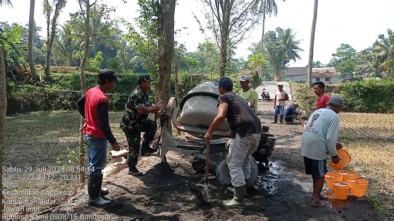 MALUKUEXPRESS.COM, Blitar – Babinsa Koramil 0808/15 Gandusari Kodim 0808/Blitar Serda Nur Hatib bersama warga masyarakat, melaksanakan kegiatan kerja bakti dan gotong royong pembangunan rabat / cor jalan menuju persawahan, bertempat di Desa Soso Kec. Gandusari Kab. Blitar, Sabtu (29/7/2023).