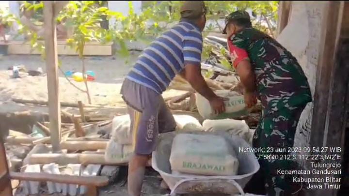 MALUKUEXPRESS.COM, Blitar – Dengan penuh semangat, Babinsa Koramil 0808/15 Gandusari Kodim 0808/Blitar Serda Alfian Zakaria bersama warga masyarakat melaksanakan kegiatan kerja bakti membantu memperbaiki rumah milik Bapak Ponidi, bertempat di Dusun Celeng Desa Tulungrejo Kec. Gandusari Kab. Blitar, Jumat (23/6/2023).