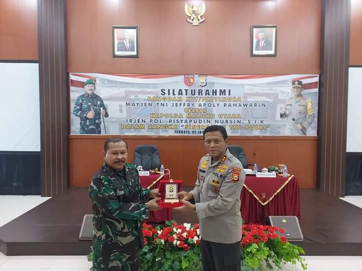 Malukuexpress.com, Panglima Kodam XVI/Pattimura Mayjen TNI Jeffry A. Rahawarin bersilaturahmi ke Kapolda Maluku Utara Irjen Pol Risyapudin Nursin, S.I.K., bertempat di Mapolda Maluku Utara Jl. Kapitan Pattimura Kel. Kalumpang Ternate Tengah. Senin (07/06/2021).