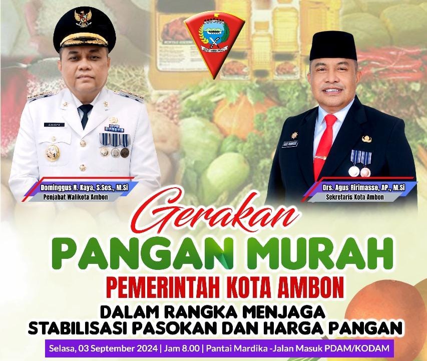 MALUKUEXPRESS.COM, AMBON, Memasuki bulan September, Pemerintah Kota (Pemkot) Ambon kembali melaksanakan Program Gerakan Pangan Murah (GPM) sebagai bagian dari upaya menjaga kestabilan harga dan daya beli masyarakat. Program ini akan digelar pada Selasa, 3 September 2024, di Jalan Pantai Mardika, Kecamatan Sirimau, mulai pukul 07.30 WIT.