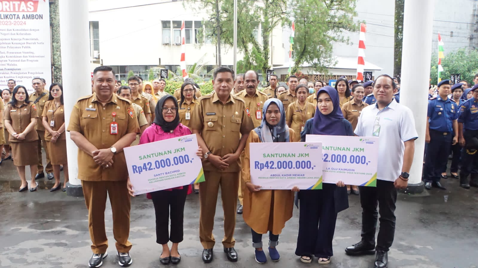Santunan yang diberikan merupakan kerjasama antar Pemkot Ambon dengan BPJS Ketenagakerjaan yang berlangsung di Balai Kota pada apel pagi bersama ASN di lingkup Pemerinta Kota, Ambon Senin 31/7/2023.