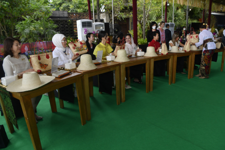 Para pendamping tersebut mengikuti workshop menghias dengan teknik decoupage, atau transfer media pada kerajinan berbahan dasar daun lontar yang telah berbentuk tas atau topi.