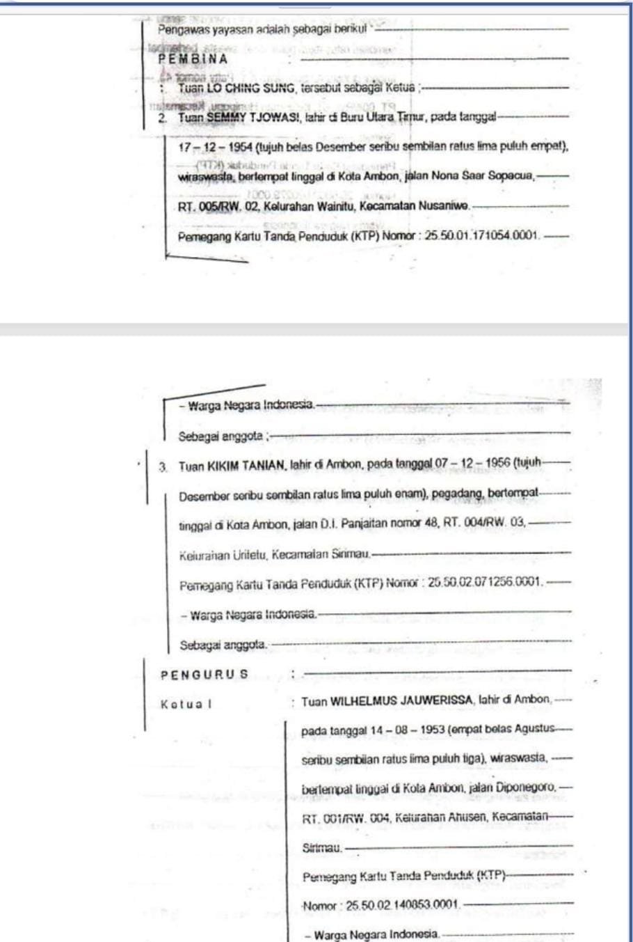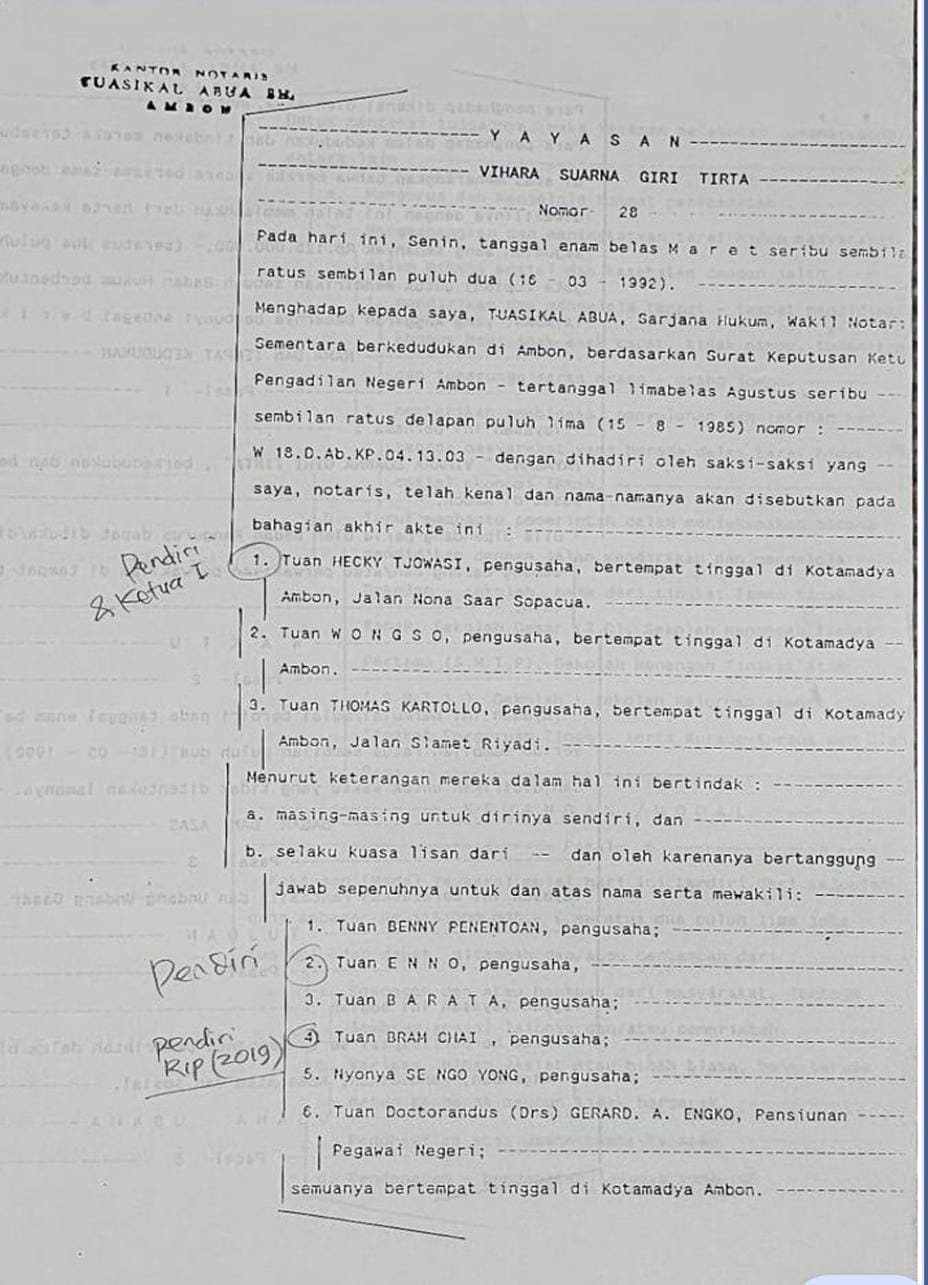 MALUKUEXPRESS.COM, Pemilik Asli YAYASAN VIHARA SUARNA GIRI TIRTA 1992 yang dibuat oleh Notaris Tuasikal Abua, dengan Susunan Pendiri terlampir, saat ini yang masih hidup adalah Bapak.Hecky Tjowasi dan Bapak.Tjoa Enno, dimana dengan susunan kepengurusan sebagai berikut Bapak Hecky sebagai ketua dan tuan Tjoa Enno salah satu anggota dalam kepengurusan didalam yayasan telah laporan pengaduan kepada Kapolresta Pulau Ambon dan Pulau Pulau Lease tertanggal Jumat 16 Agustus 2024, satu bundel laporan diwakili oleh Pengacara A.R Sanaky, S.H.,M.H bersama rekan dan diterima oleh M. Latupeirissa.