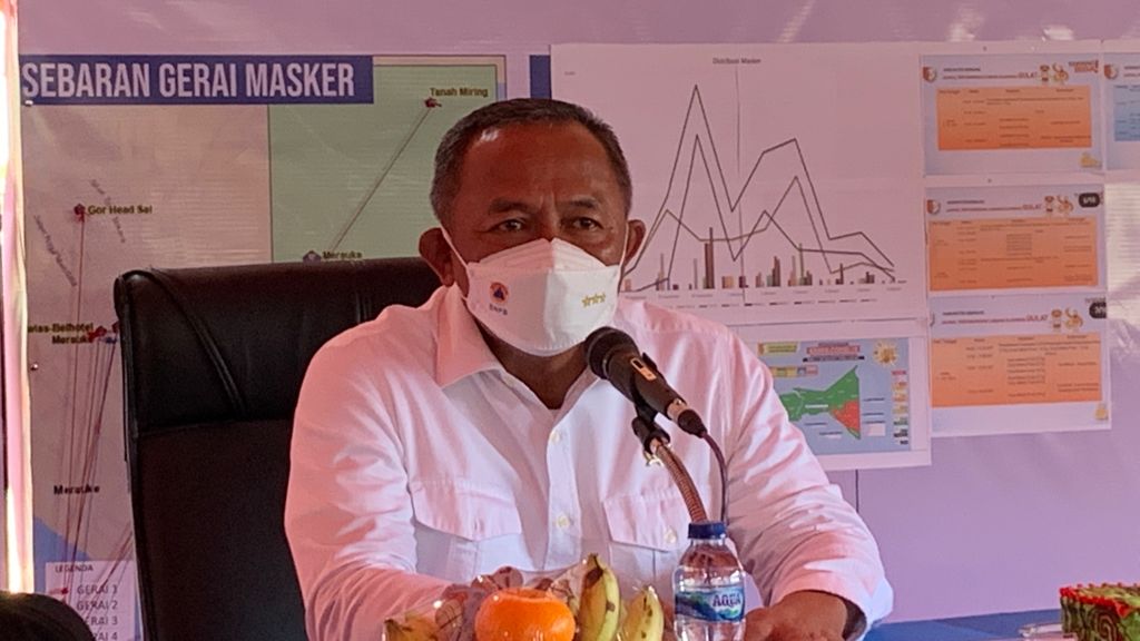 MERAUKE – Penyelenggaraan Pekan Olahraga Nasional (PON) XX Papua yang aman Covid-19 tidak terlepas dari peran relawan protokol kesehatan (prokes). Hal tersebut disampaikan Kepala BNPB Letnan Jenderal TNI Ganip Warsito, S.E., M.M. di hadapan para relawan saat berada di Pos Komando Sub Satuan Tugas Prokes Merauke pada Kamis (7/10).