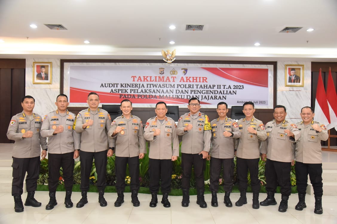 MALUKUEXPRESS.COM, POLDAMALUKU- Kapolda Maluku Irjen Pol Drs. Lotharia Latif, SH., M.Hum, didampingi auditor dari Itwasum Polri Brigjen Pol Drs. Herukoco, M.SI., dan Wakapolda Maluku Brigjen Pol Stephen M. Napiun, SIK., SH., M.Hum., memimpin taklimat akhir audit kinerja Itwasum Polri tahap II tahun 2023.